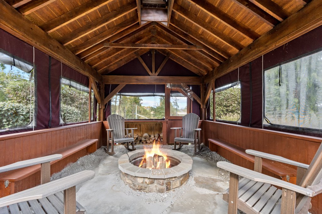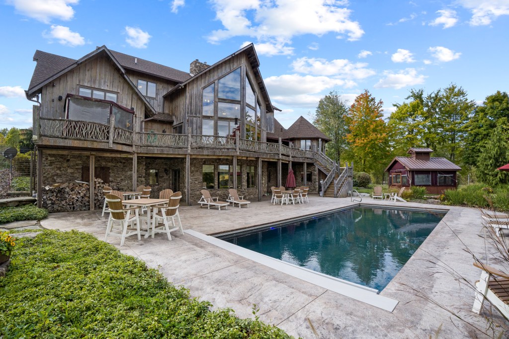 Nestled in the woods, the 9,225-square-foot private residence features 6 bedrooms, 7.5 baths, and boasts cathedral ceilings, floor-to-ceiling reclaimed timber, elm bark details, soaring stone wood burning fireplaces, and expansive views throughout the home. Fit to entertain, the lower level provides an authentic saloon and theater room leading to extraordinary outdoor living with a gunite pool and stone waterfall overlooking remarkable scenery.