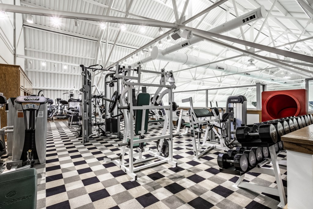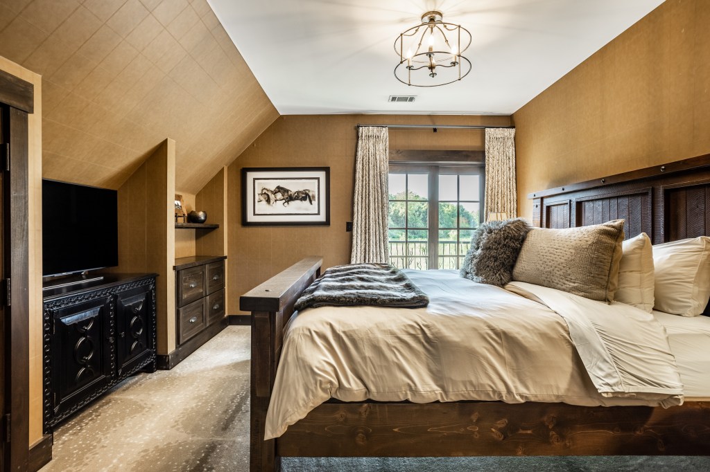 At the heart of the estate is a 14,653-square-foot recreational barn and attached residence, featuring a full-size indoor tennis court with 60’ ceilings, mezzanine-level fitness center, and a heated six-car garage. The connected living quarters include a great room with timber beams, full kitchen, and flexible loft space, all overlooking the grounds.