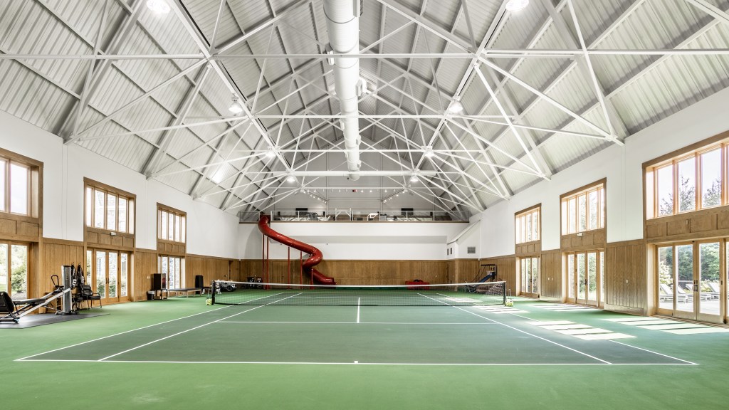 The second property spans more than 72 gated acres and is designed for recreation, privacy, and large-scale entertaining. Highlights include a recreational barn with attached living quarters featuring a full-size indoor tennis court with 60-foot ceilings, mezzanine fitness center, and heated garage space; a luxury cabin; a private stocked lake; heated zero-entry pool; trail systems; and a helipad. Together, these amenities create a resort-caliber environment for recreation, gatherings, and multi-generational use.